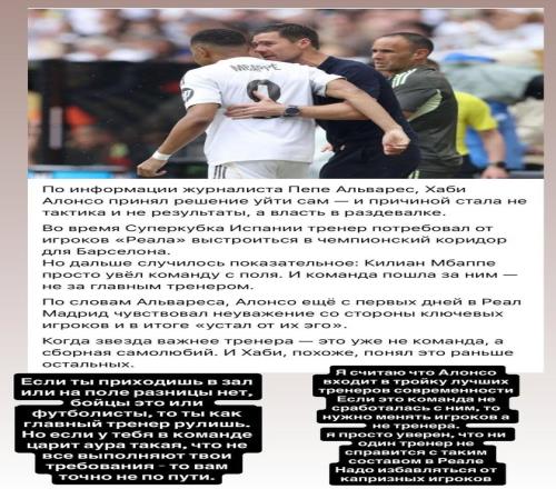“我认为阿隆索是当今世界足坛三大最佳主帅之一,如果球队与他配合不佳,就该更换球员,而不是主教练。我确信没有任何一位教练能驾驭得了皇马这样的阵容,必须清除任性的球员才行。”