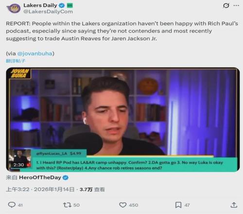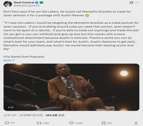 昨天里奇-保罗在自己的播客中说道:“如果我是湖人的管理层,我会联系灰熊,用里夫斯在内的交易方案,来换取小贾伦-杰克逊!”一个月前,里奇-保罗谈到湖人的阵容时曾说:“我不认为湖人有机会进入西决,他们很容易被对手防住。”