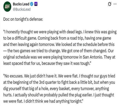 赛后连一向以鼓励鸡汤著称的主帅里弗斯都罕见公开吐槽球员,直言自己该早点换下主力球员,他们好像腿都跑不动了,攻防两端完全不在状态。
