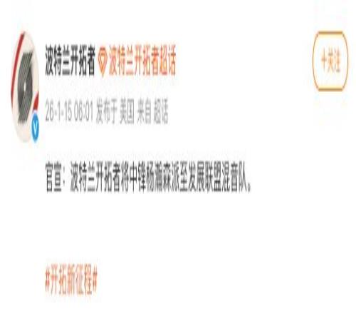 1月15日,@波特兰开拓者 宣布,将中锋杨瀚森派至发展联盟混音队。